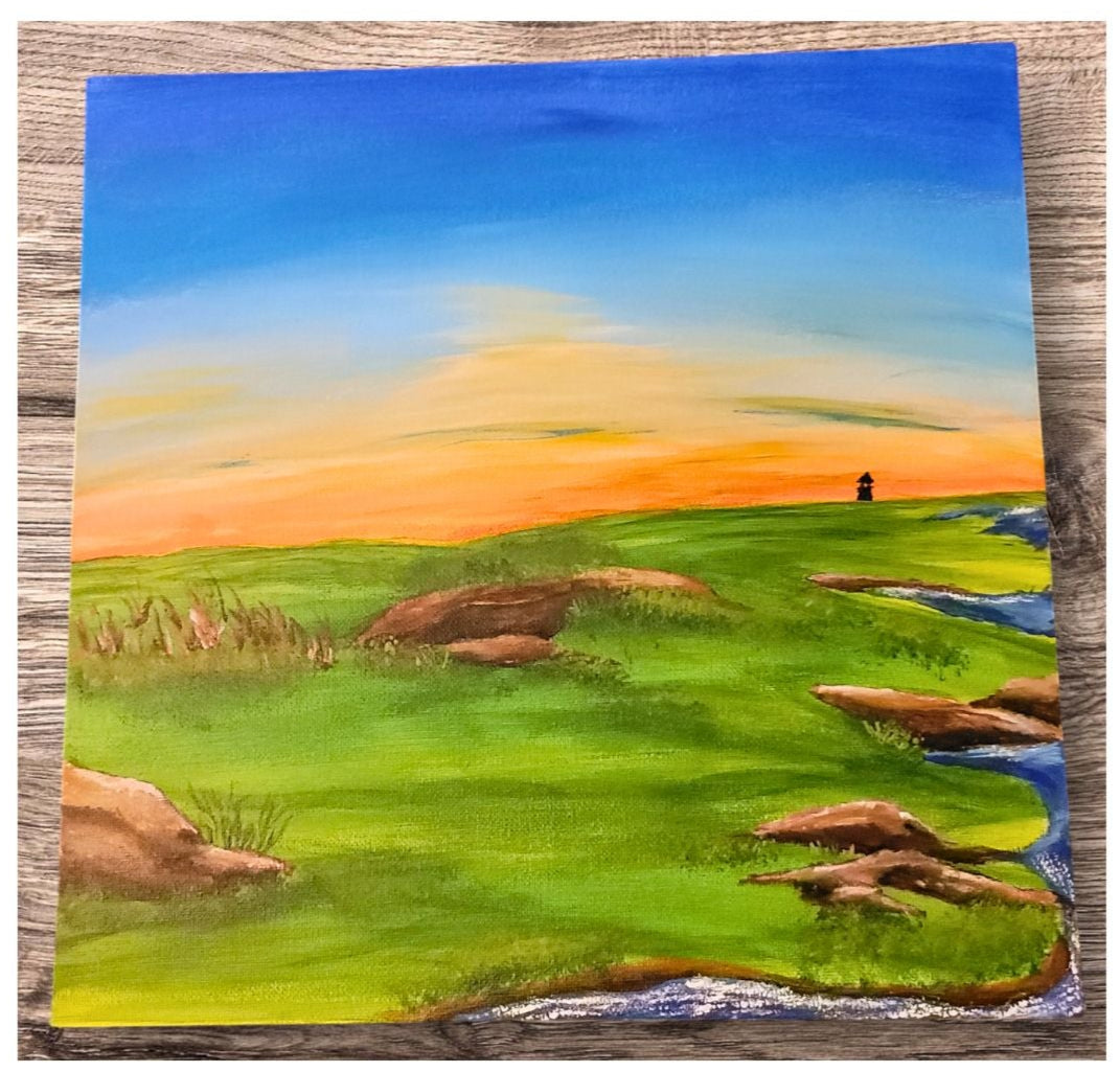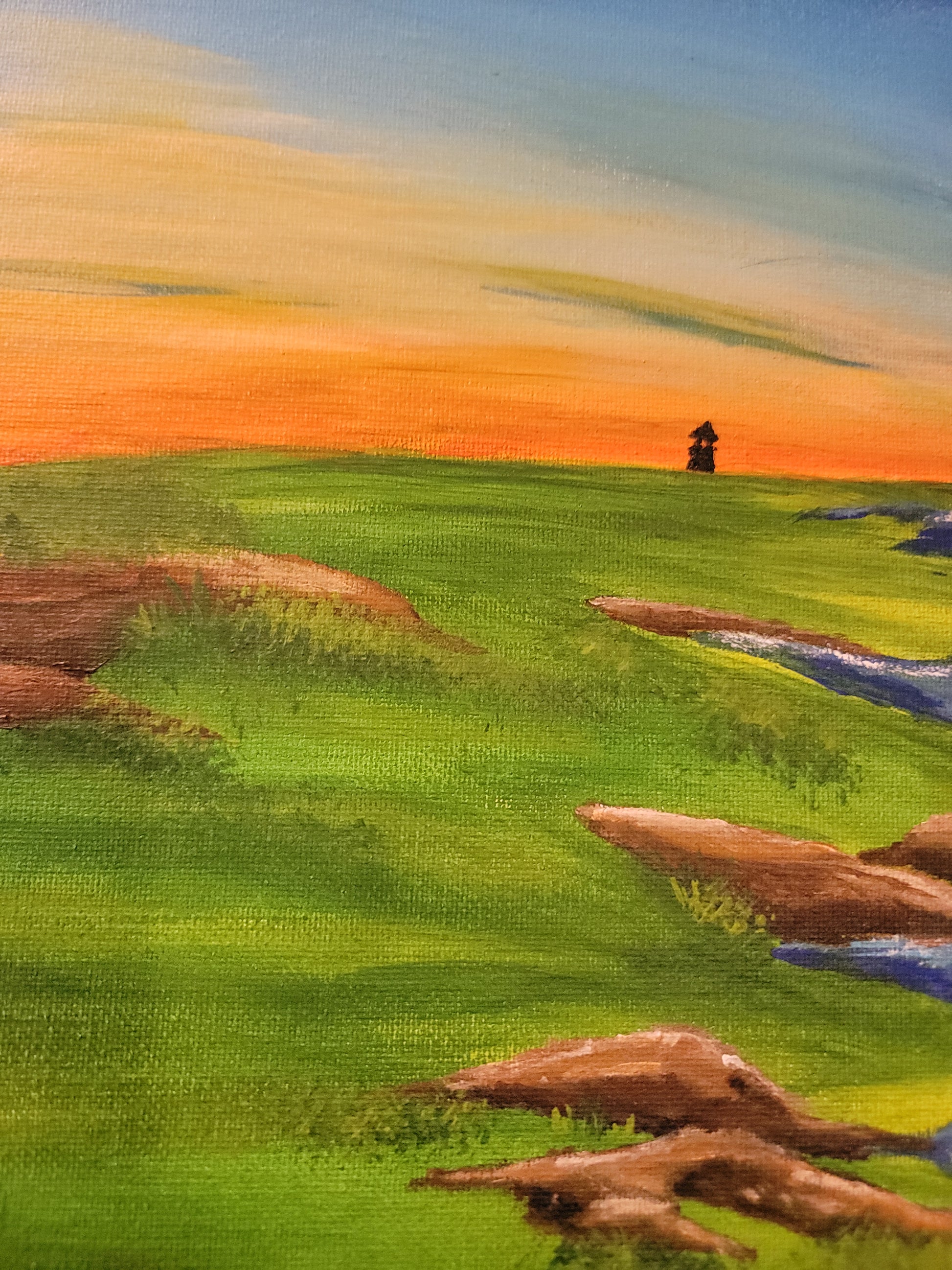 The rolling hills and rocks give way to the setting sun. Imagine walking through the thick grass, the beautiful colors of the sunset, water slowly splashing along the coast. A perfect setting to end the day.